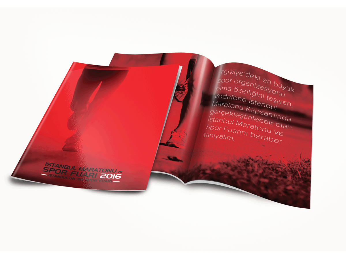 Vodefone Sporluğunda düzenlenen, 2016 İstanbul Maratonu tanıtım kataloğu tasarımı. Tasarımında kırmızı ağırlık renklerin olduğu bir anlayış benimsenmiştir. Çünkü kırmızı insanı heyecanlandırır ve dinamik tutar; koşunun temel amacıda bu tutkuyu benimser. Maraton öncesi ve sonrası için hazırlanan fuar etkinliği ile ilgilide içerisinde detaylı bilgi verilmiştir.