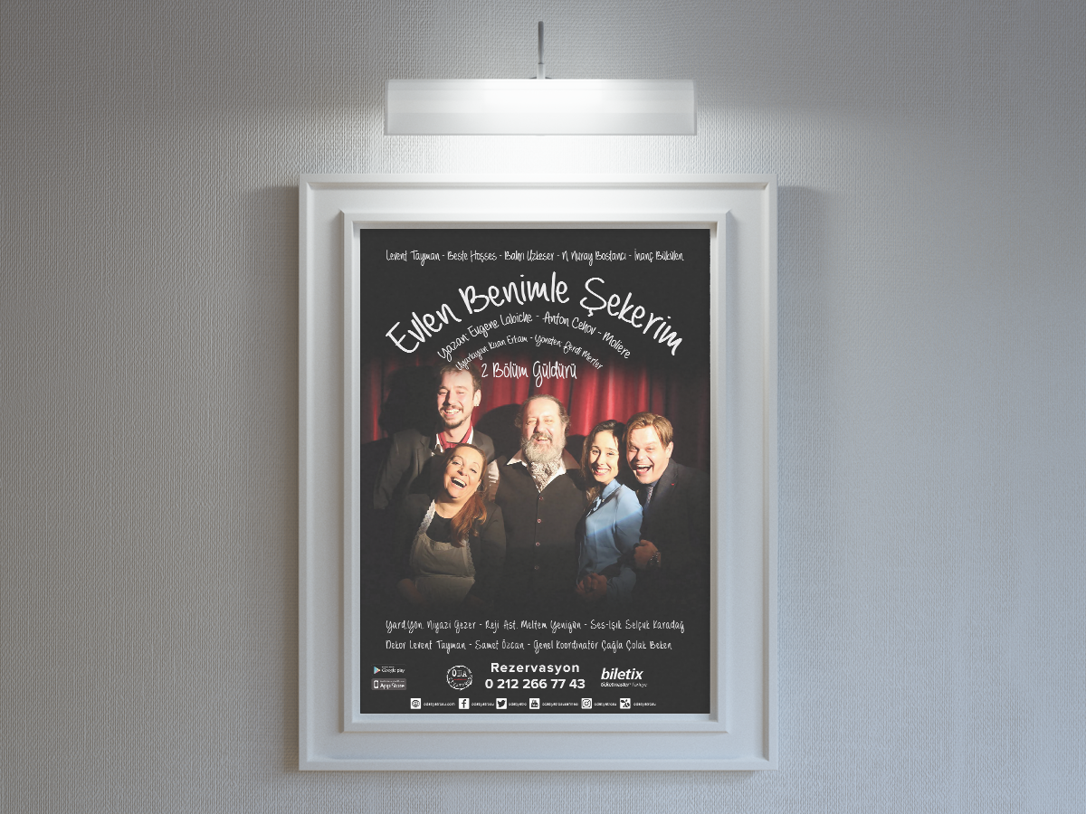 Oda Tiyatrosu samimi kadrosu ve profesyonel hocalarıyla 11 yıldır sahnede perdelerini açıyor. "Evlen Benimle Şekerim" izlenmesi gereken bir romantik komedi. Tüm seyircileri salona çekmek için yapılmış bir afiş tasarımı.