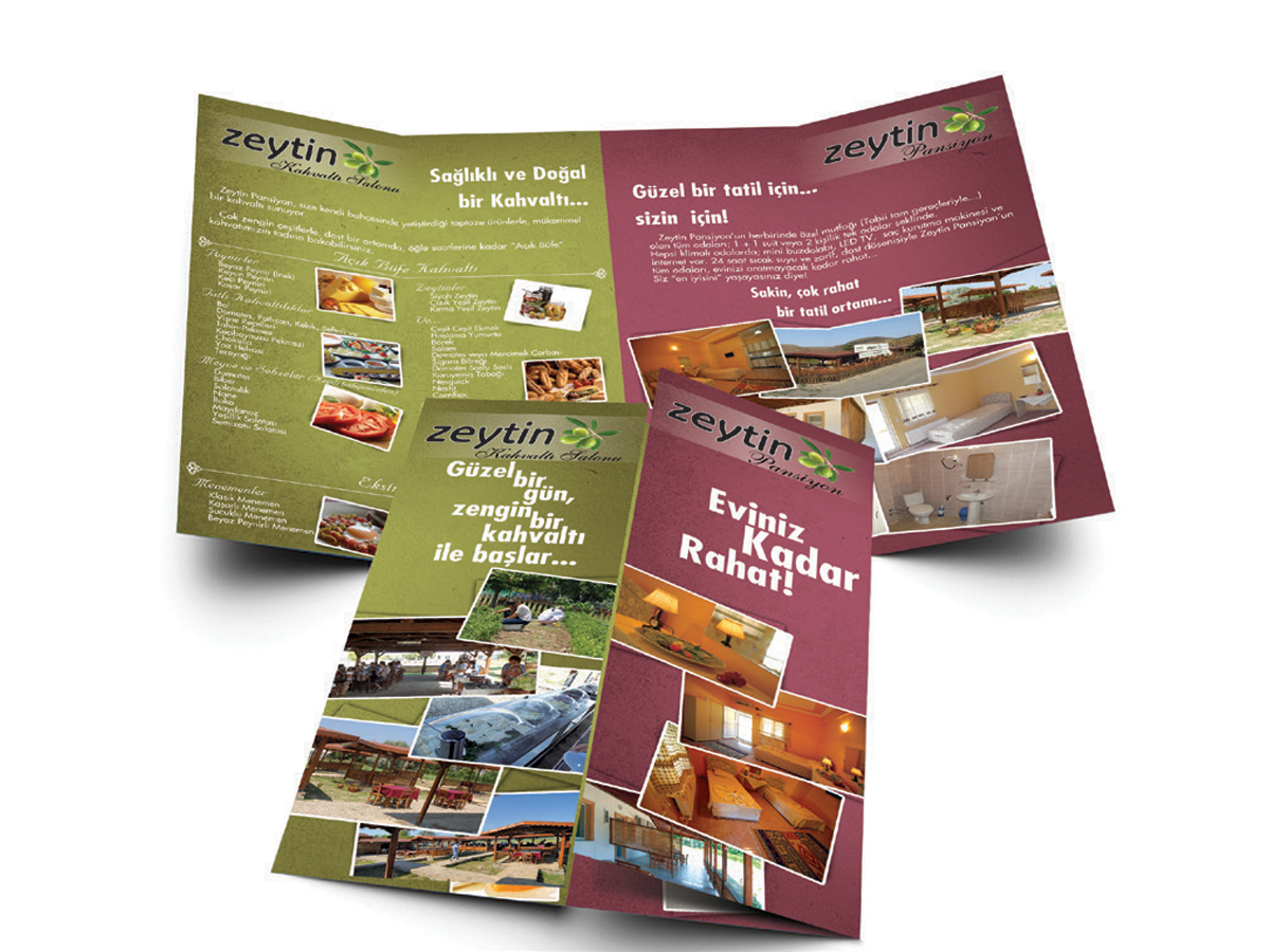 Gökçeada’nın güzel ve ferah havasının içine işlediği Zeytin Pansiyon & Kahvaltı Salonunun kendisi gibi şirin bir broşür isteği üzerine yapılmış benzersiz çalışmadır.